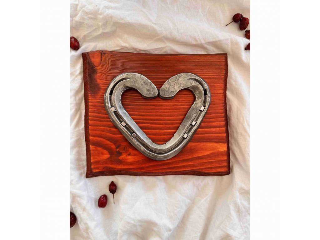 Prírodná dekorácia Srdce z podkovy na drevenej doske ošetrenej prírodným olejom. Vzadu je dierka na zavesenie.
